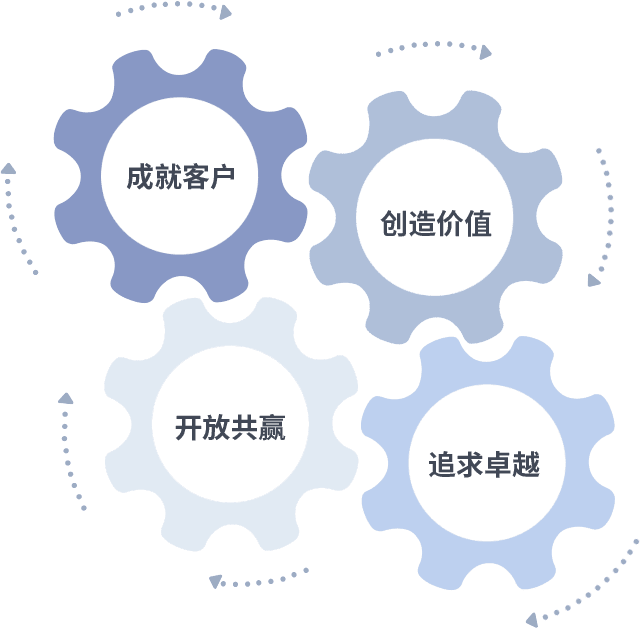 成就客户是一切决策的出发点,,,,创造价值是衡量所有工作的标准,,,,追求卓越是我们做事做人的态度,,,,开放共赢是我们的格局也是最终的结果。。。价值观的齿轮环环相扣,,,推动着组织里的每个人不断向前。。。。